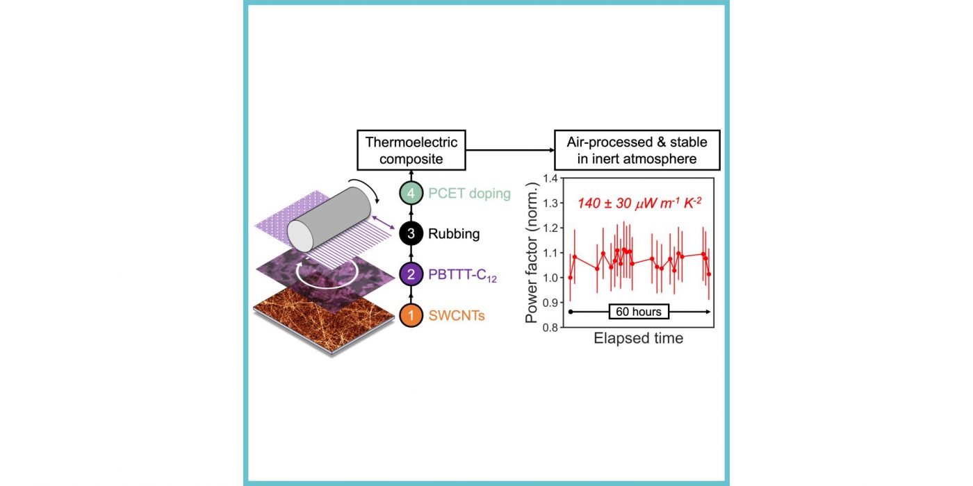 Thermoelectric (TE) materials exploit the Seebeck effect to transform a temperature gradient into a voltage difference and a net current flow. Carbon-based semiconductors such as polymer-sorted single-walled carbon nanotubes (SWCNTs) and conjugated polymers are promising TE candidates that combine unique processing and cost advantages against traditional inorganic counterparts. After the introduction of extrinsic charge carriers via doping to improve the TE properties, various strategies exist to further boost the TE performance of organic semiconductors including their alignment and blending in composites. Here, the TE power factor (PF) of isotropic and aligned networks of semiconducting SWCNTs, PBTTT, and their composites are benchmarked for common p-doping with 2,3,5,6-tetrafluoro-7,7,8,8-tetracyanoquinodimethane (F4TCNQ). Composites of SWCNTs and CPs aligned by hot rubbing exhibit superior performance compared to isotropic films. Moreover, the PF increases with the SWCNTs mass ratio in the composites. A PF of 150 ± 20 μW m−1 K−2 is achieved in these composites upon F4TCNQ doping, which exceeds the figures attained in neat and densely packed SWCNT networks doped with that same molecular acceptor, thus confirming the positive effect of SWCNT/PBTTT blending on TE performance. While F4TCNQ doping is transient, when doping these composites via proton-coupled electron transfer in air, the PF remains high (140 ± 30 μW m−1 K−2) and stable over at least 60 hours of storage in inert atmosphere. These promising results bring organic TE composites closer to open-air processing as required for applications in printed TE generators.